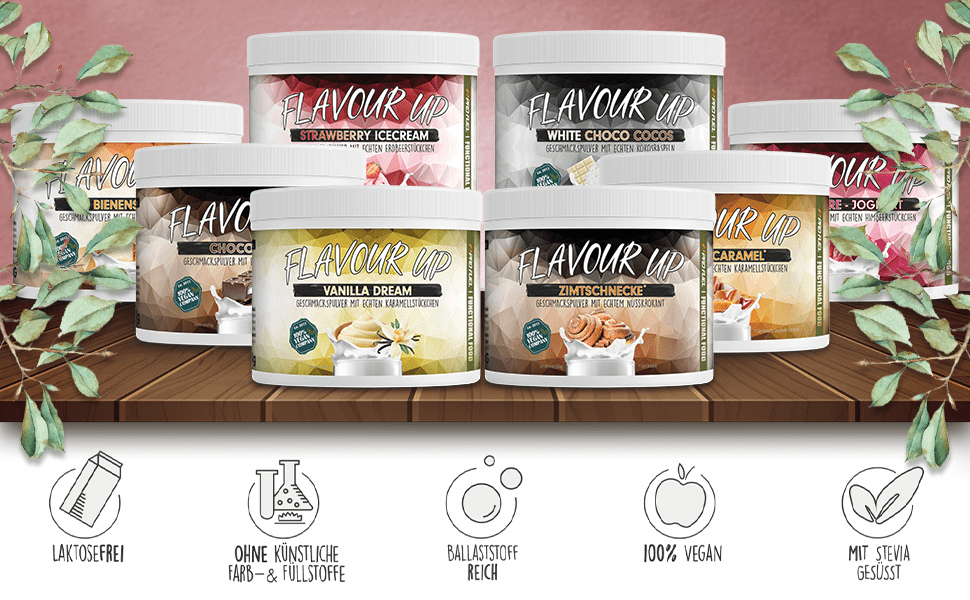 Unser Engagement für Qualität zeigt sich in der Auswahl der Inhaltsstoffe. Alle FLAVOUR UP Geschmackspulver sind vegan und enthalten keinerlei tierische Produkte. Darüber hinaus verzichten wir vollständig auf künstliche Farbstoffe, damit Sie das Beste aus Ihrer Ernährung herausholen können.