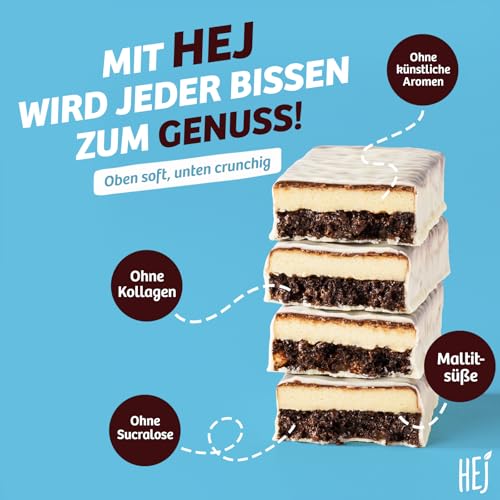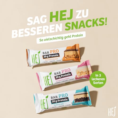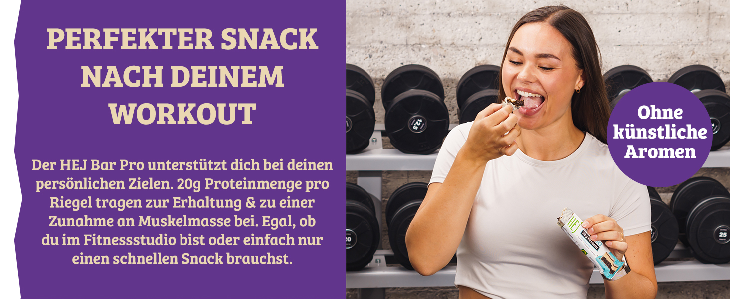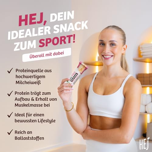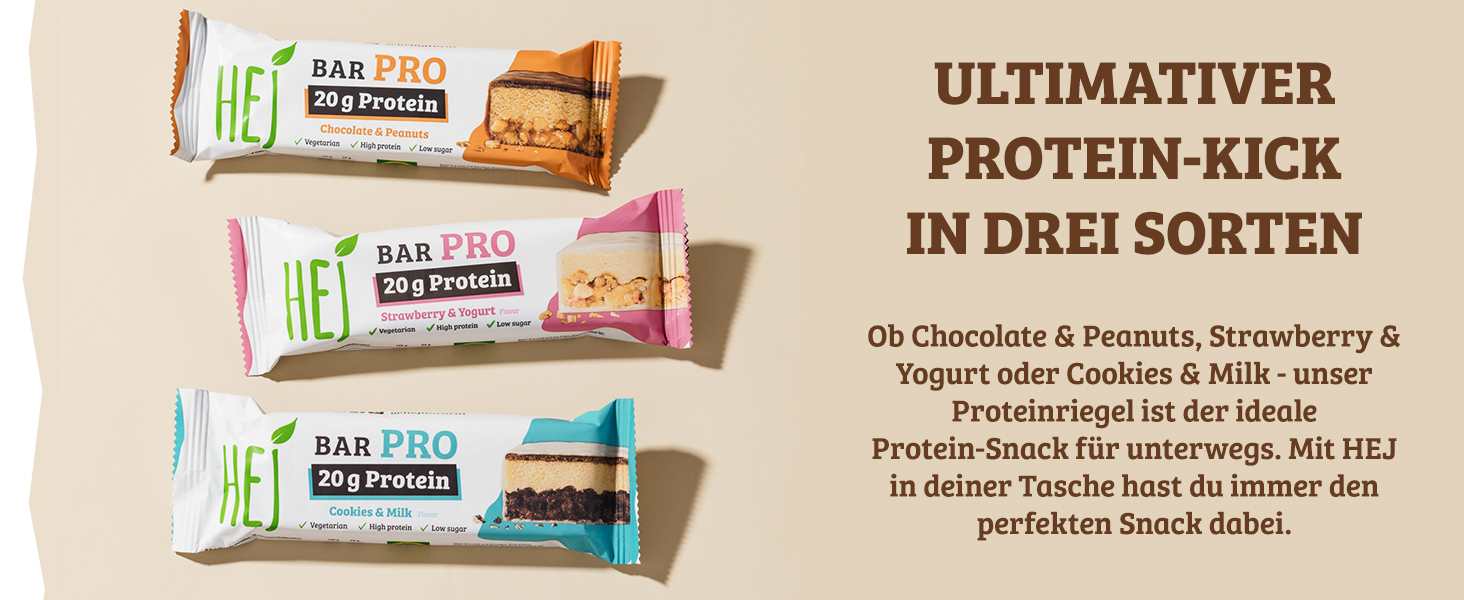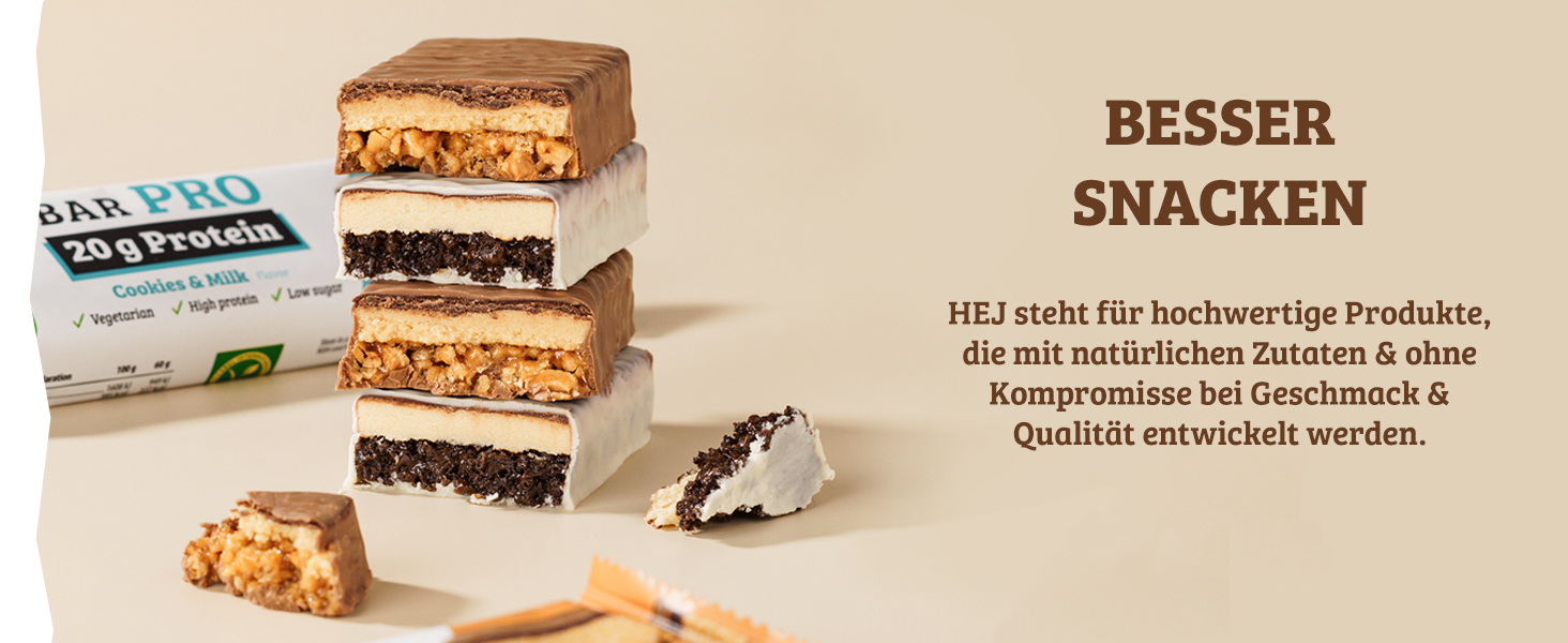 HEJ steht für hochwertige Proteinriegel, Shakes und Snacks, die ohne Kompromisse entwickelt wurden. Unsere Produkte unterstützen deinen bewussten Lebensstil, indem sie dir gesunde und schmackhafte Optionen bieten. Mit dem HEJ Bar Pro entscheidest du dich für einen Snack, der gut für deinen Körper und tollen im Geschmack ist.