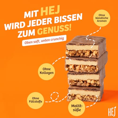 Mit weniger als 3g Zucker pro Riegel kannst du unbesorgt naschen. Der HEJ Bar Pro kombiniert eine cremig-softe Schicht mit einer knackig-crunchigen Textur – ein Genuss, der deinen Gaumen verwöhnt, ohne dabei auf ungesunde Zusätze zurückzugreifen. Perfekt für alle, die auf eine ausgewogene Ernährung Wert legen und dennoch nicht auf Geschmack verzichten möchten.