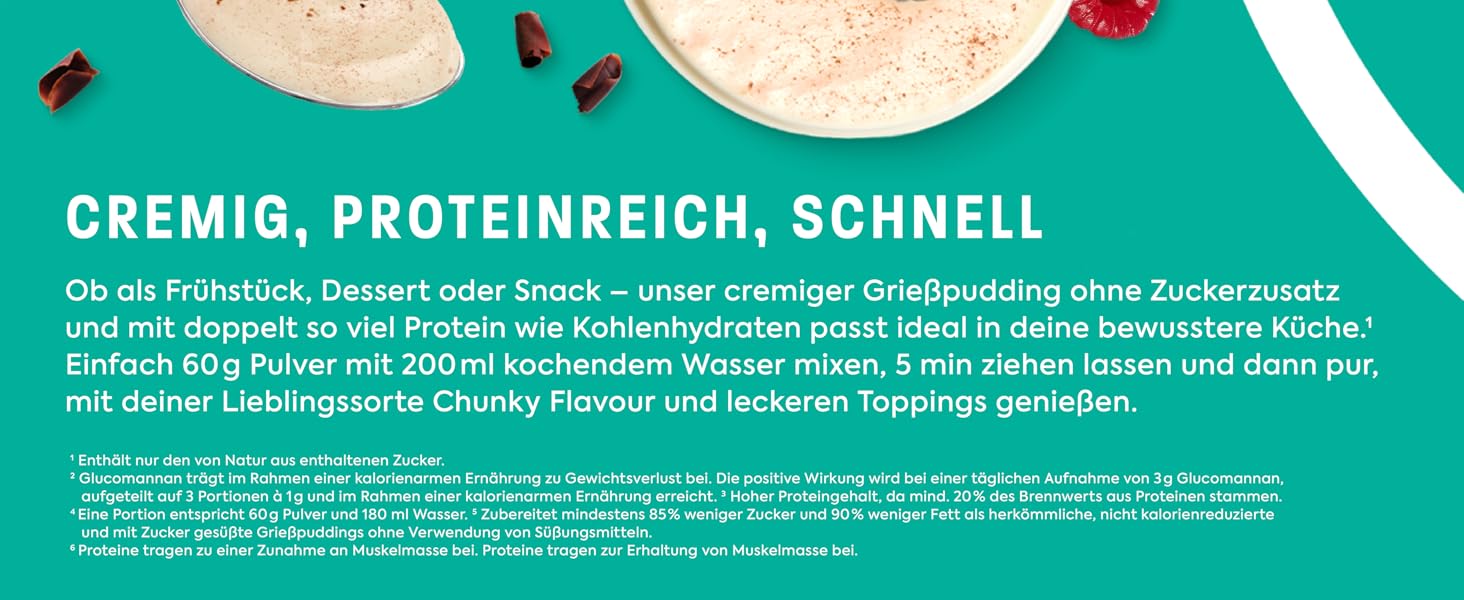 Mit bis zu 85 % weniger Zucker ist dieser Grießpudding die perfekte Ergänzung für deine Ernährung. Er ermöglicht dir, auf bewussten Genuss zu setzen, ohne auf Geschmack verzichten zu müssen. Der reduzierte Zuckergehalt erlaubt es dir, auch bei der Süßspeise den gesunden Lebensstil beizubehalten.